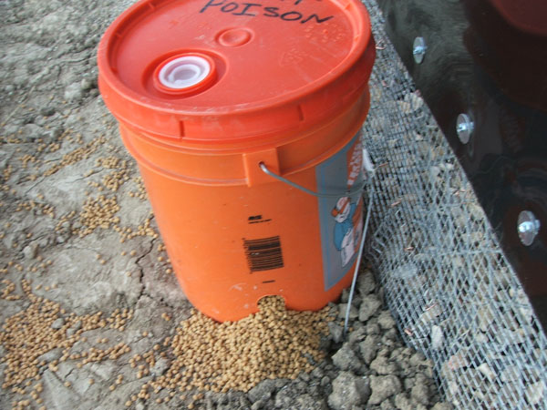 This is a five gallon container of rodent poison. It is refillable with a multi-feed rat poison, controlling the incoming animals for up to ninety days. This step will greatly contribute to rat control in the area. |